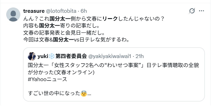 んん?これ国分太一側から文春にリークしたんじゃないの?