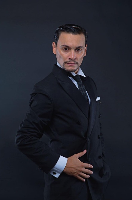 髪をオールバックにして鋭い目線をカメラに向ける姿は、精悍な印象を与えます。輪郭や目がジョニーデップに似ていますね。
