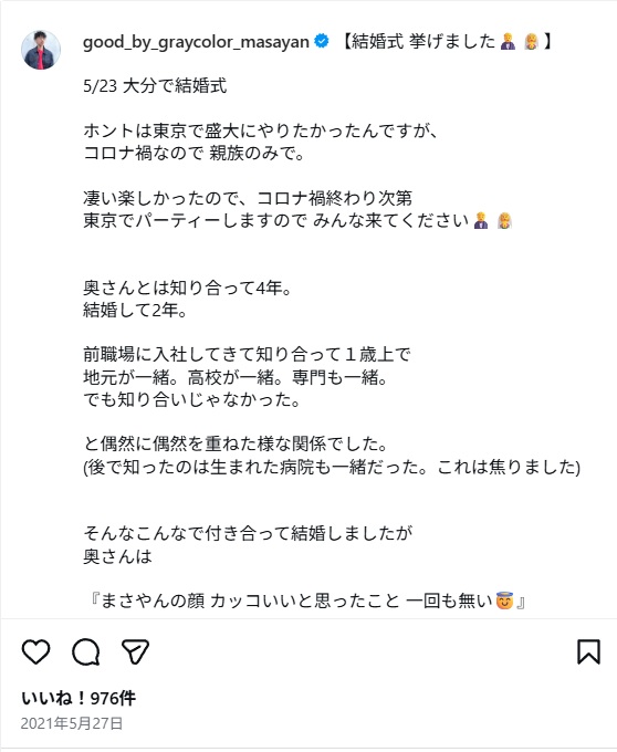 松田陽子さんは、大分県出身であることが分かっています。こちらは、挙式したことを知らせる松田政也さんのインスタグラムのスクショです。