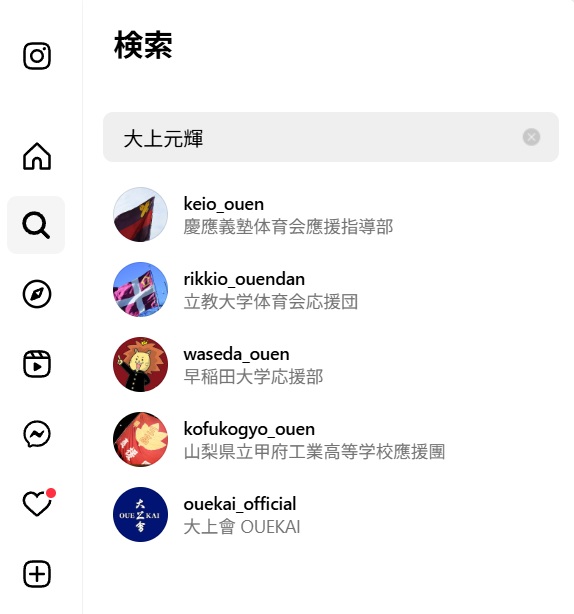「大上元輝」で検索すると、立教大学や早稲田大学などの応援団のアカウントがヒットしました。大上さんは、23歳なので若者に人気のインスタをやっていた可能性は高いですが、ニックネームでアカウントを登録していたのかもしれません。