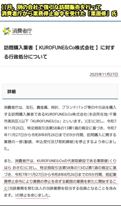 栗原修氏が代表を務める別会社「KUROFUNE&Co株式会社(クロフネ)」に下された、消費者庁による行政処分です。