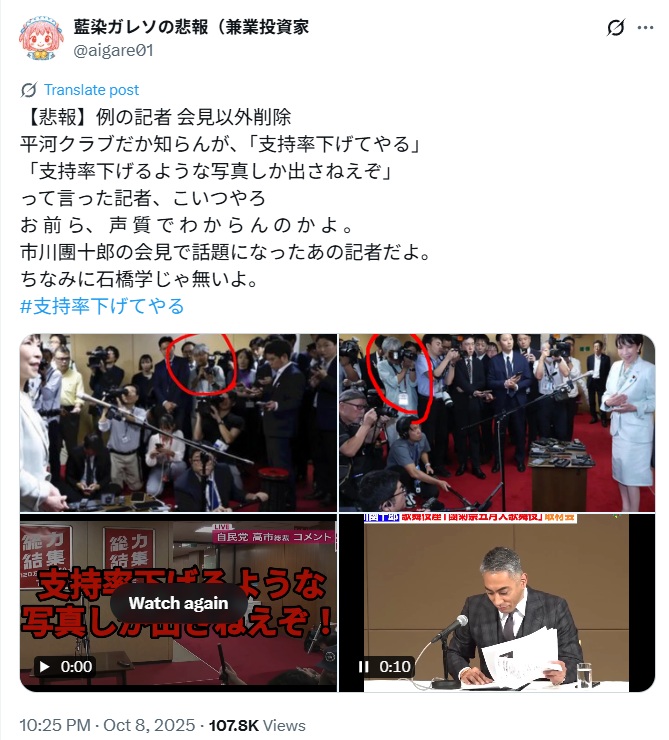 10月9日、時事通信は高市早苗総裁の取材待機中に「支持率下げてやる」と発言したのは、同社の男性カメラマンであることを明かし、謝罪しました。