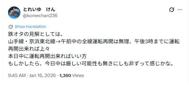 鉄道に詳しい人によれば、「本日中に再開できれば上出来」との意見もあります。