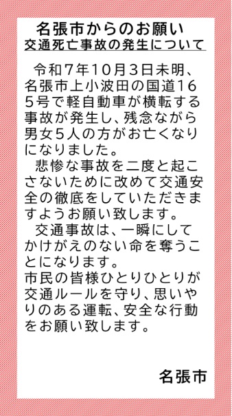 男女5人の尊い命が失われたことを受けて、名張市は公式サイトで交通ルールの徹底を訴えています。